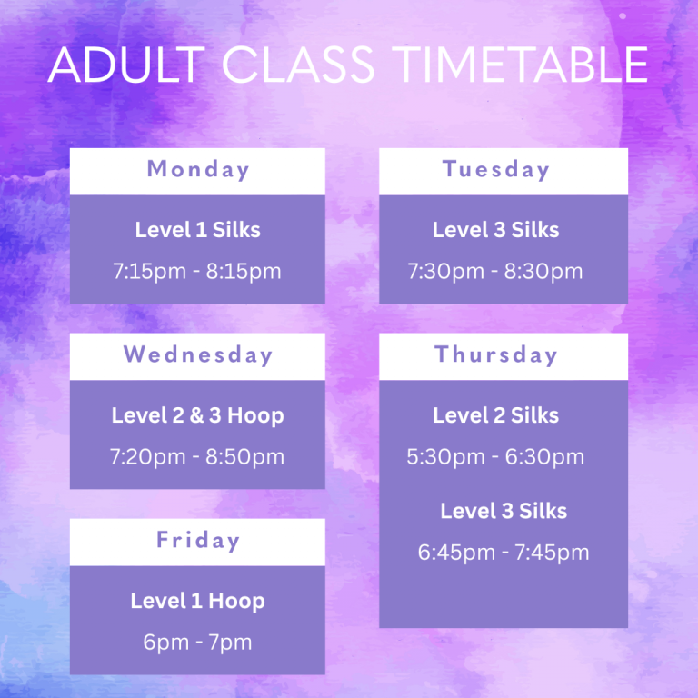 We run evening adult classes throughout the week in aerial silks and aerial hoop. These classes range from beginner to advanced ability. We have drop in classes available or the option to book in a 5 week block. Our classes run throughout the year in term time, we take school holidays off from classes in the studio as it works with a lot of our students with families.